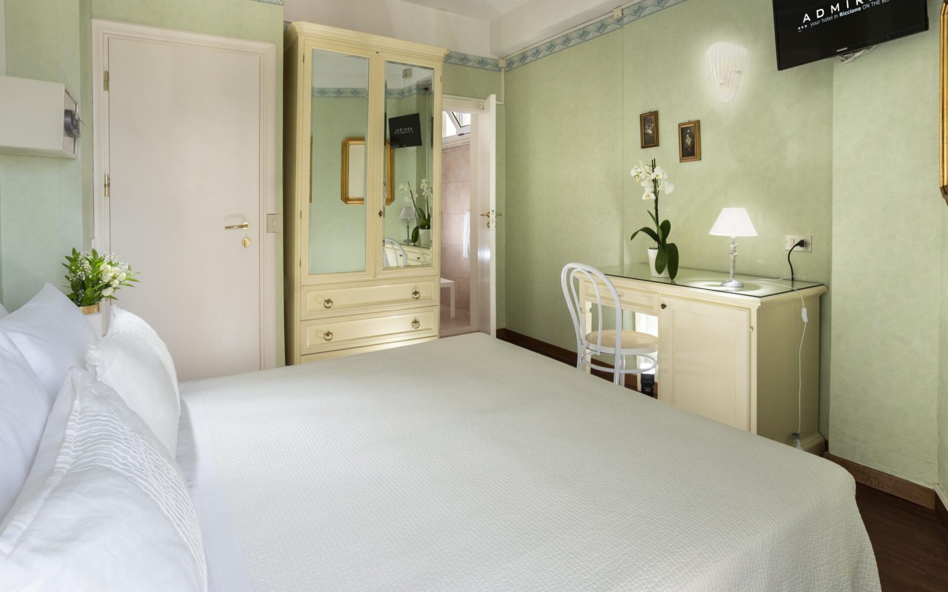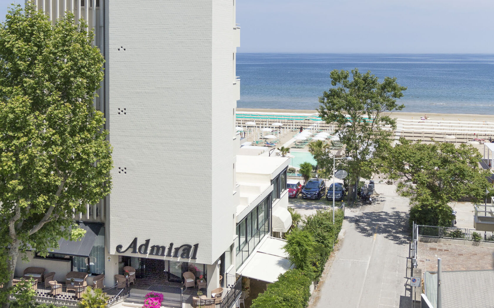 Das beliebte ***s Hotel Admiral liegt im Zentrum von Riccione, direkt am Meer und mit eigenem Zugang zum Strand inkl. Schwimmbad (gegen Gebühr). Das Haus verfügt über eine Bar, ein Restaurant mit herrlichem Panoramablick auf Strand und Meer, in dem traditionelle mediterrane und internationale Gerichte serviert werden, auf einer gemütlichen Terrasse kann bei Schönwetter das Frühstück eingenommen werden. Die ruhigen und modern ausgestatteten Zimmer haben alle einen Balkon mit Blick auf Küste und Meer, Minibar, Haartrockner, Klimaanlage, Sat-TV und Wlan.