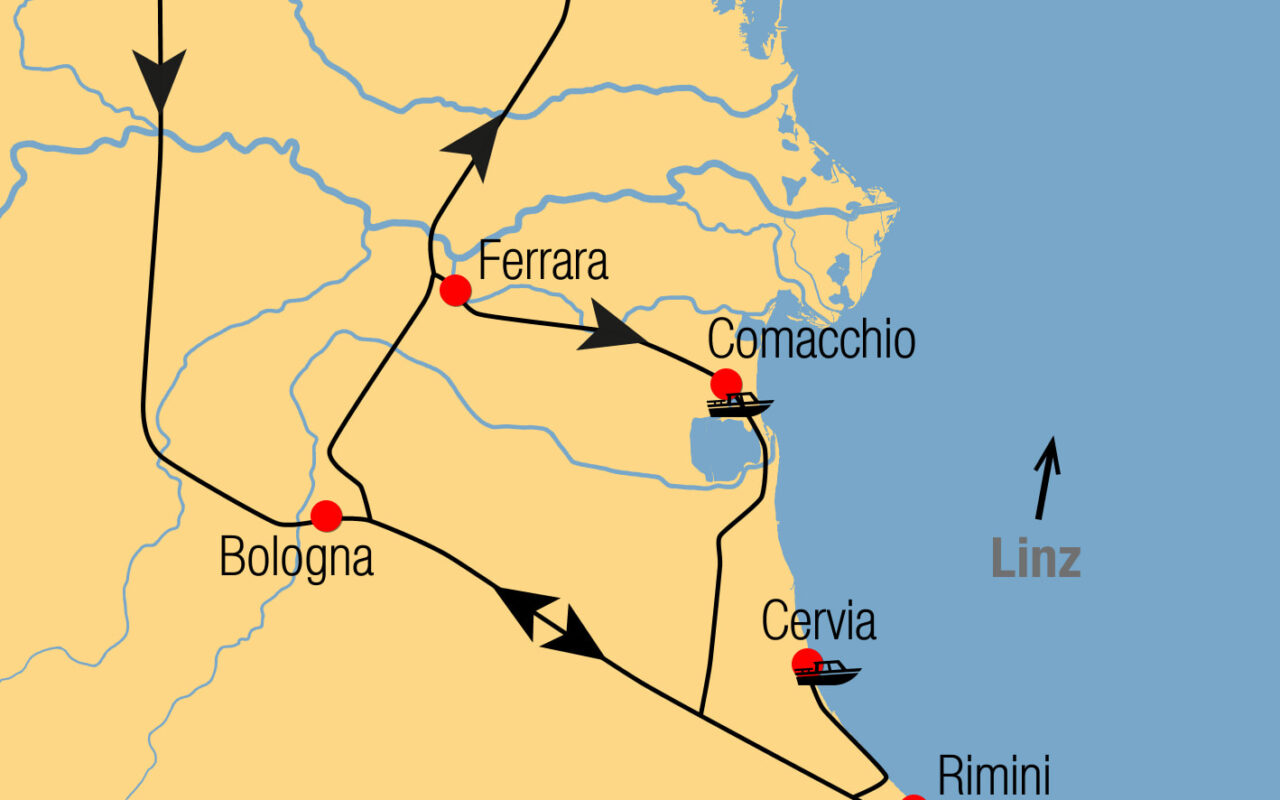 Zentral in Riccione, einem der traditionsreichsten Badeorte der mittleren Adria, und nur wenige Meter vom Strand entfernt, liegt Ihr Hotel ideal für das Besichtigungsprogramm: Cervia, Comacchio, Pesaro und das grandiose Ferrara sowie fakultativ ein Ausflug in die Kulinarik-Metropole Bologna stehen am Programm. Freuen Sie sich nach den Ausflügen auf ein erfrischendes Bad im Meer.
