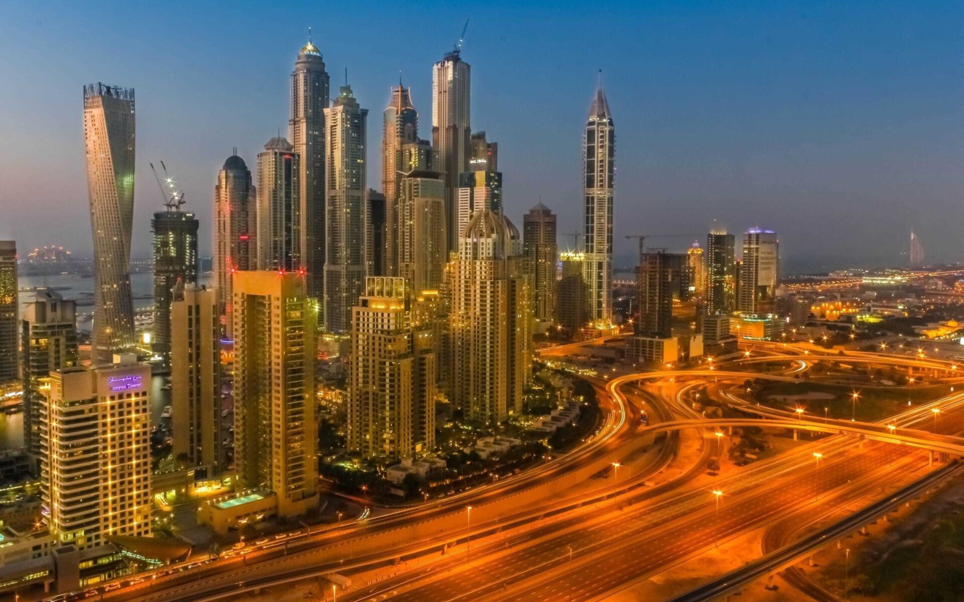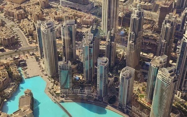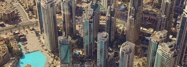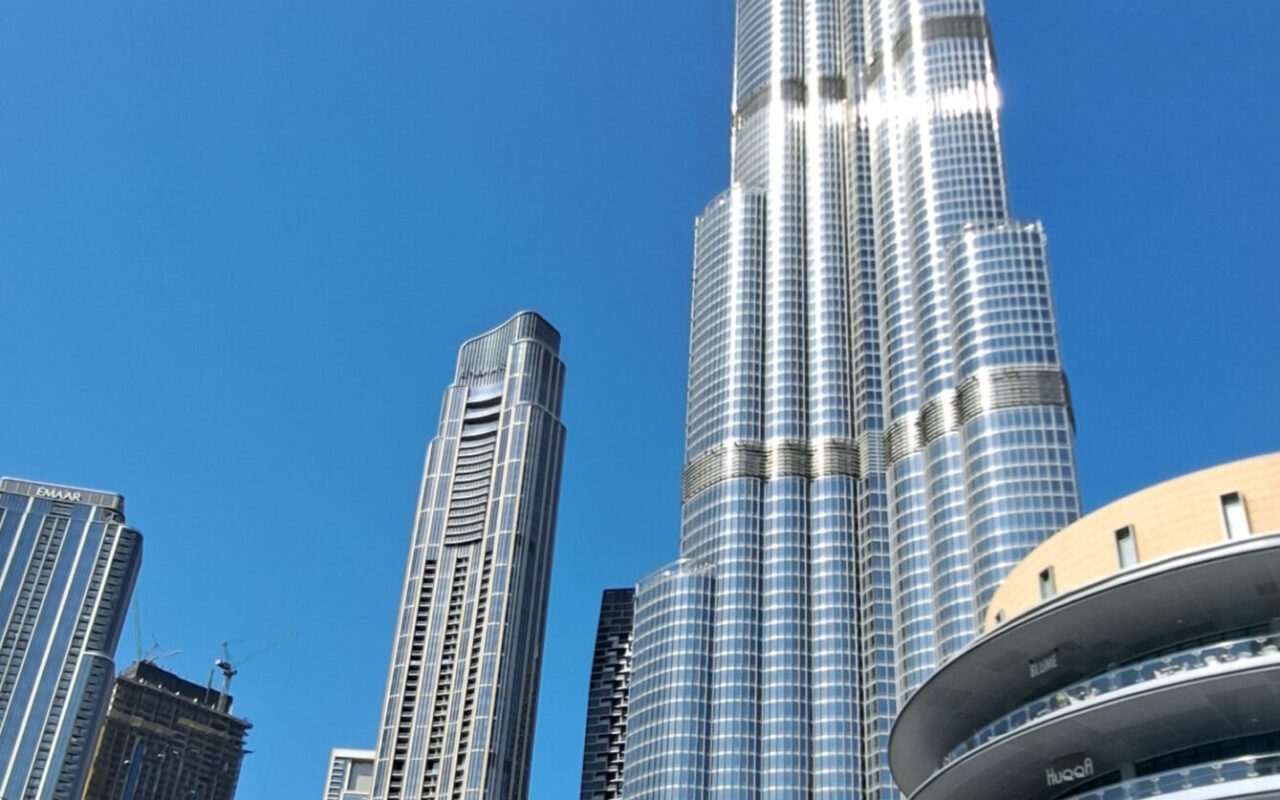 berühmten Wolkenkratzer. Der Burj Khalifa dominiert die Skyline und überragt die Innenstadt von Dubai mit einer