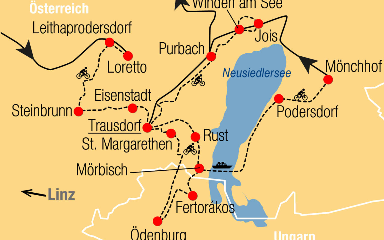 27.08.: Anreise von Wels über Sattledt - Linz - St. Valentin vorbei an Heiligenkreuz nach Loretto im Burgenland. Hier laden wir die e-bikes aus, machen eine kurze Mittagspause und werfen einen Blick in die imposante Basilika Maria Loretto. Dann starten wir auf dem Leitha Radweg Richtung Leithaprodersdorf und folgen dem Fluss bis zum schönen Neufeldersee. Die Route führt uns über Steinbrunn vorbei an zahlreichen Heurigen bis in die Landeshauptstadt Eisenstadt. Im idyllischen Schlosspark Esterhazy legen wir eine Rast ein, bevor wir noch eine kurze Etappe nach Trausdorf an der Wulka absolvieren. Hier beziehen wir die Zimmer im beliebten **** Hotel Wilhelminenhof. Abends erwarten uns in einem regionalen Heurigen Burgenländische Spezialitäten.