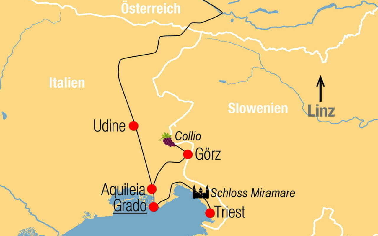 Diese Reise führt auf die romantische Sonneninsel Grado. Schon zu K & K Zeiten war die Stadt an der gleichnamigen Lagune ein beliebtes Urlaubsziel. Beim Ausflugsprogramm in die Region Friaul-Julisch Venetien sind auch die Hafenstadt Triest, das herrliche Schloss Miramare und die Weinregion Collio inklusive.