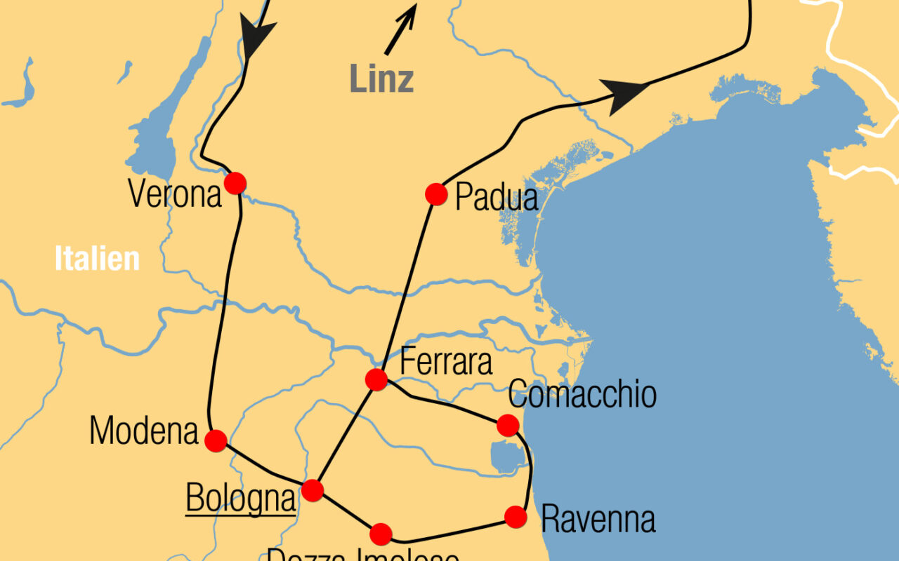 05.09.: Am Vormittag Fahrt nach Ravenna. Bei einer geführten Besichtigung erkunden Sie die interessante Altstadt mit der Piazza del Popolo, wo die Spuren der venezianischen Periode noch besonders deutlich sind. Außerdem besuchen Sie die frühchristlichen und byzantinischen Monumente mit ihren grandiosen Mosaiken. Neben der berühmten Basilika San Vitale aus dem 6. Jh., beherbergt die Stadt nicht weniger als sieben weitere UNESCO-Welterbestätten. Nach der Mittagspause fahren Sie über Comacchio weiter nach Ferrara. Die mittelalterliche Altstadt von Ferrara ist ebenso UNESCO-Weltkulturerbe und ist vor allem für ihre von der Herrscherfamilie Este errichteten Renaissancebauwerke, wie z.B. dem von einem Wassergraben umgebenen Castello Estense, bekannt. Sehenswert ist außerdem der Dom, gewidmet dem heiligen Georg, der zugleich Schutzpatron von Ferrara ist. Nach Ihrer Rückkehr in Bologna steht noch ein gemütliches gemeinsames Abendessen auf dem Programm.