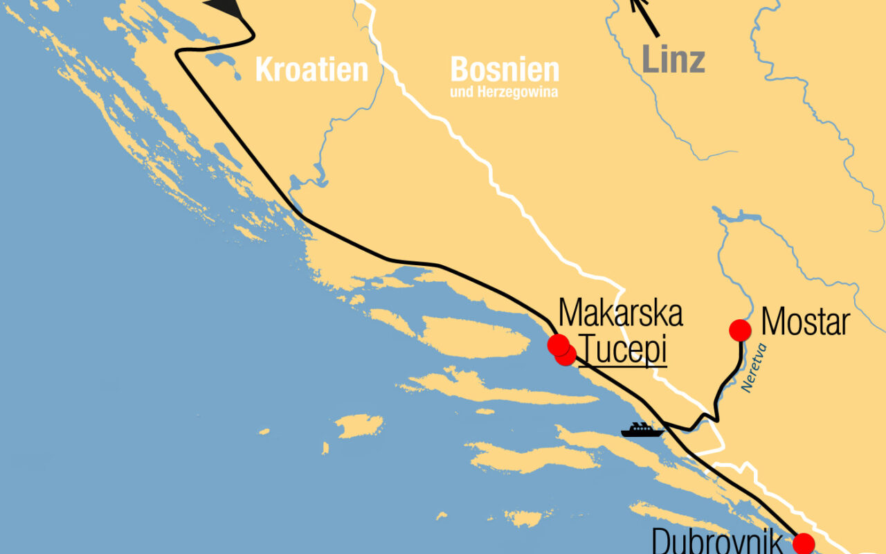 13.10.: Anreise von Linz über Wels - Pyhrnautobahn zur slowenischen Grenze und über Marburg - Zagreb - Karlovac auf der Autobahn durch das Landesinnere Kroatiens nach Tucepi am Fuße des Biokovo-Gebirges. Abendessen und Zimmerbezug im beliebten **** Hotel Alga.